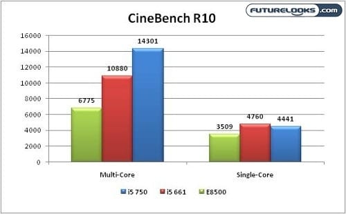 Equally CPU intensive is Cinebench. You can see it highly favors Multi-Core and Hyper-Threaded performance. But, Single Core rendering favors the 661 overall and essentially leaves the Turbo-less i5 750 and E8400 in the dust. Intel Turbo Boost dynamically overclocked the i5 661 to 3.6GHz which you can’t get from the other two processors.