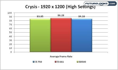 At 3.3GHz, the Core i5 661 offers far more than enough frequency and bandwidth to produce extremely playable frame rates using our chosen GPU, the GTX 295. Since the game is single threaded utilizing only one CPU, Core 0 got a small frame rate boost with Turbo enabled on the 661, while the other cores don’t have that capability. Any questions?