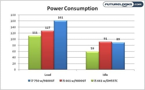 Putting on our “Green” hat, we check out just how much juice the newly minted CPU sucks up. Yes, the Clarkdale would probably be catatonic if it used any less power. Keep in mind though that these results were taken with and without using a Zotac 9800GT 512MB video card. This is ideally where users are going to go when considering a micro-ATX platform, especially for Home Theater use. But again, even without an external graphics card, the system does do a lot of great things on its own.