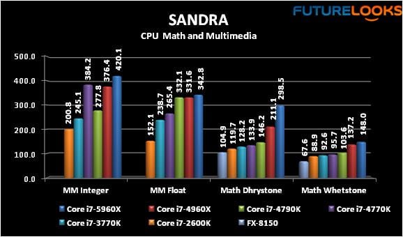 Starting off with SANDRA CPU tests, the Core i7-5960X is the most powerful CPU to date, despite the lower frequency 3.0GHz cores. The threads make up the difference immensely.