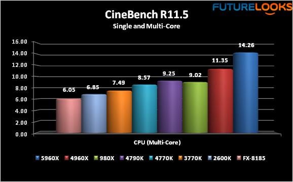 Including R11.5 one last time, we wanted to show you where the Core i7-5960X lands in terms of CPU rendering performance. It certainly is the king of this benchmark by a large margin.