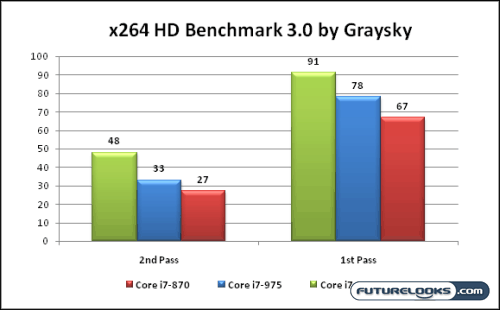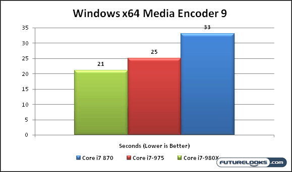 This handy benchmark tool can be downloaded at many locations. It dual pass encodes a small 720p video and presents you with frame rate averages. Not surprisingly, the 980X is a media beast besting my precious Core i7 975.
