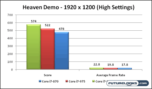 The Heaven Demo is one of my new favorite 3D benchmarks because it tests DX9, DX10, and DX11 as well as the point something or others in between. There’s a noticeable average frame rate difference. But, it’s the Score that changes the most leaving my Core i7 870 gaming machine spinning.