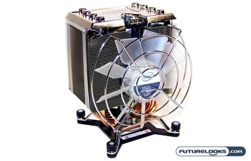 The new tower cooler, a departure from the little round hunk of aluminum, sports a polished copper base, copper heat pipes, and about five inches of stacked fins to help dissipate heat. As you may already know, copper heat pipes are excellent for efficiently carrying heat away from the processor. It’s up to the two speed (Q-quiet and P-performance) 92mm fan to keep all that cool. While we aren’t sure of the 92mm fan’s specs, these fans usually require some higher RPMs to do so.