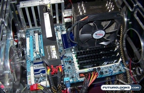 GIGABYTE sent us their GA-X58A-UD5 Motherboard flashed to the Gulftown ready F4 BIOS. The new retail XE CPU cooler was installed and given some bench time to make sure it works. More on that later.