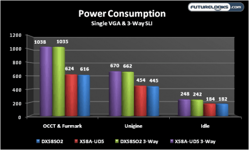 Any X58 system running high end graphics like the GTX 580 will consume some power at load. The DX58SO2 build needed only 182 watts at idle and 445 watts at load with a single GTX 580. But, it’s amazing how 3-way SLI tosses just about any and all consumption right out the window. That’s just how it is when running crazy gaming systems. Still, it is a slightly lower consumer of power than the UD5.