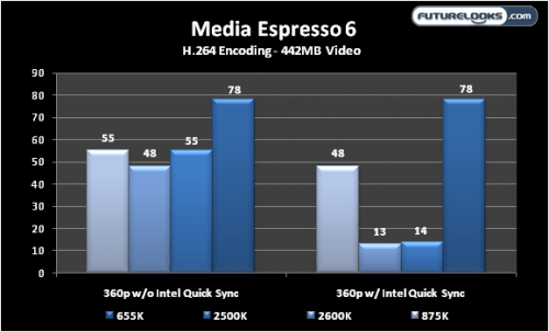 When Sandy Bridge’s H.264 IQS hardware acceleration is enabled, encoding just flies like there’s extra processors hidden somewhere in the computer case. Lynnfield and Clarkdale rely on brute Turbo power and Hyper Threads to get the job done. This is why Sandy Bridge is capable of out multitasking the other cores.