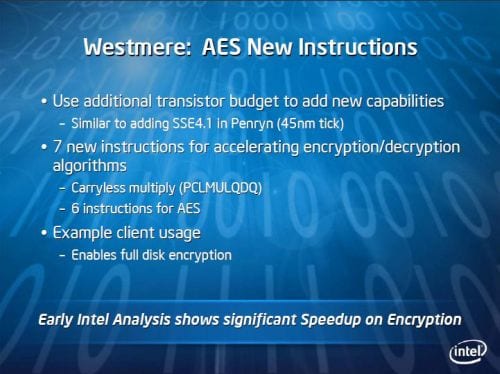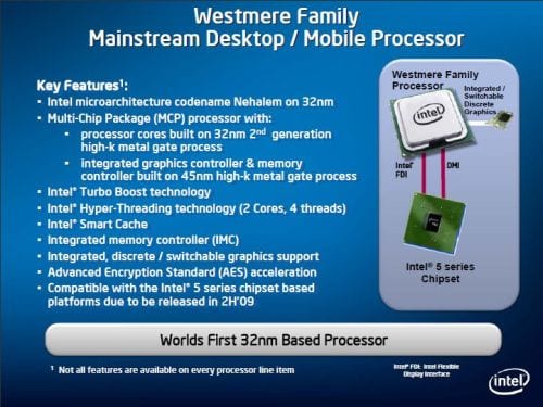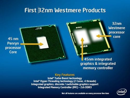 Westmere will bring to us a new 32nm desktop and mobile processor line and will come in quad and dual core flavors. Westmere also offers Turbo Boost Technology (sort of like an auto overclock), Smart Cache (optimized cache for multi-core processors), Advanced Encryption Standard (AES), and switchable integrated graphics. Nehalem’s powerful on-die memory controller will also be accompanied by an integrated graphics controller built on the 45nm process.