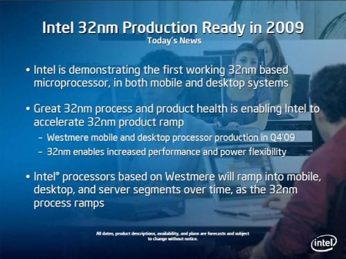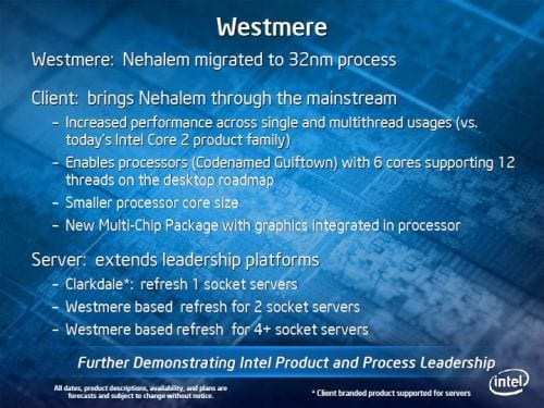 Intel’s latest roadmap reveals future Westmere and Sandy Bridge Processors. Cutting through the technical speak, Westmere improves upon the powerful 45nm process Nehalem Microarchitecture found inside the current i7 Bloomfield processors. Westmere will receive a 32nm die shrink which will help improve power consumption and lower thermal properties. This shrink should be highly anticipated by enthusiasts as both of these characteristics are ideal for overclocking.