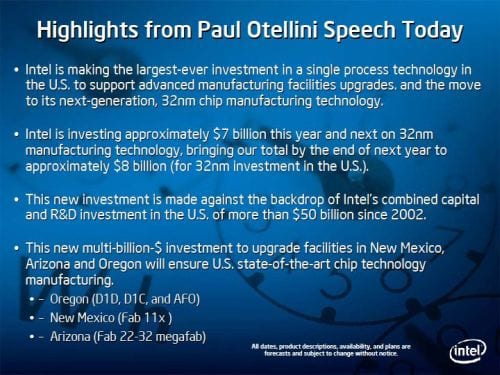 A good case in point is Intel’s decision to invest $7 Billion in their U.S. Facilities (while other companies are closing down their facilities) over the next two years which incidentally follows Intel’s development model as they design and release a new micro architecture. All in all, this is just smart business. Their investment should stretch much further and accomplish more today as cost costs are lower than two years ago. Perhaps this aided Intel in their decision to drop two i7 processors from the roadmap slated for the Mainstream desktop line: Havendale and Aurburndale.