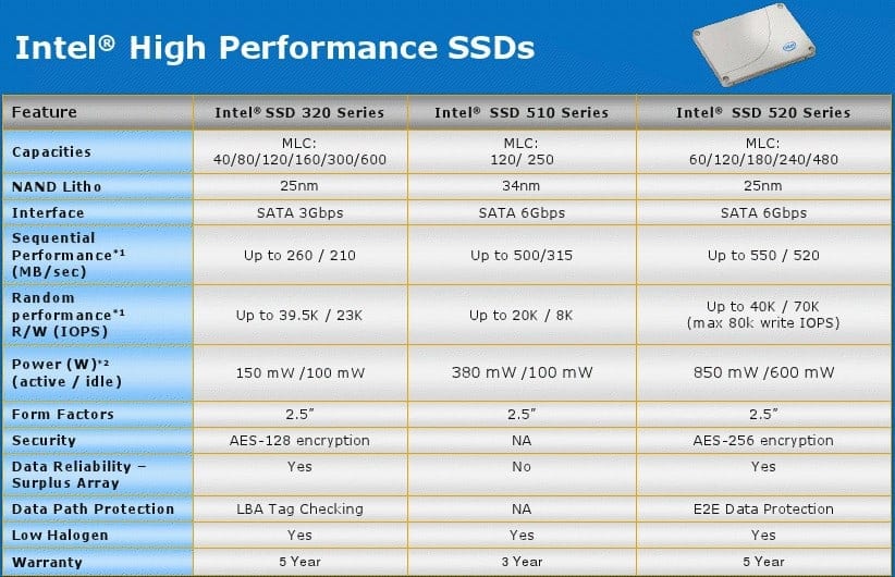 Like most consumer oriented SSDs, the 520 uses standard MLC (multi-layer cell) NAND that is still far more affordable than max endurance SLC (single layer cell) NAND reserved primarily for the Intel 710 enterprise series SSDs. The reason is because SLC is capable of 900TB to 1.5PB write endurance as well as faster 4K data block performance and comes with a higher price. For our MLC drive here, pairing better grade NAND with smarter controllers created by Intel and SandForce extends their life span which is deserving of better warranties. The SSD 320 and SSD 520 both offer a 5 year warranty. The more price conscious SSD 510 offers a 3 year. These warranties are almost identical to regular hard drives depending on the models. In some cases, they are actually better due to the hard drive industry scaling back on length of warranty.