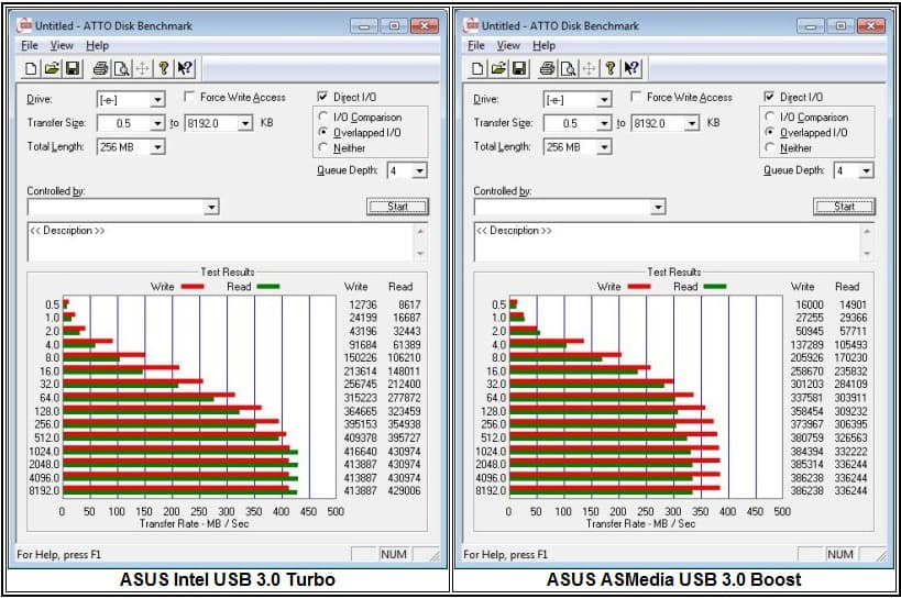 While sequential performance is better on the Intel PCH (left), it’s the 4.0 data performance that favors the ASMedia. This performance will favor the ASMedia controller when connecting external storage like a multi-drive RAID array or docking stations with big drives. They need the bigger queue to respond to more requests.