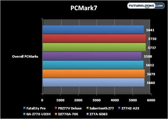 All the subsystem performance numbers culminate to what you see here. The Deluxe and Sabertooth solidified their place on the food chain right away. With slower transient Turbo frequencies, the rest of the pack lagged behind a bit. The ECS actually didn’t reach 3.9GHz Turbo mode very often despite its overachieving motif. The rest of the boards seemed to bounce around 3.8GHz more often. The ASUS boards reached 3.9GHz more often than the rest of the field which results in the overall higher scores.
