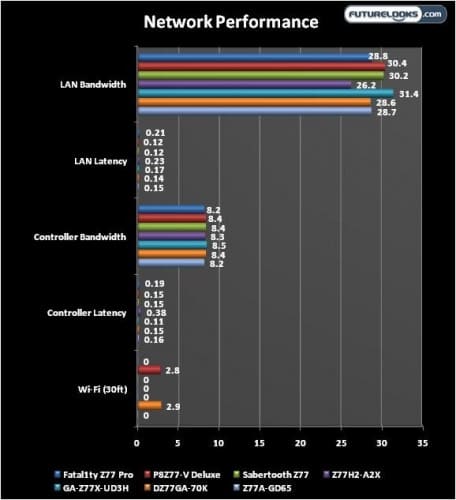 Network performance is comparable across all the boards. The boards with Intel LAN controllers were a bit faster. Given the distance and two walls between the wireless access point, the Deluxe and 70K Wi-Fi did well. Unfortunately, the ECS board’s problematic network wouldn’t work. There was no performance gain using any of the bundled “network software” with any of the boards. Those utilities simply allow prioritized program control to manage any unnecessary network usage. If you want the best control, you have to bypass the Windows network stack. Currently, only Bigfoot Networks and their Killer NICs truly do this. Unfortunately, none of the boards in this particular round up were using that network controller.