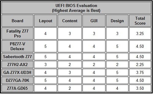 The score card says it all and here’s why. While all the boards could use some more BIOS definitions and/or descriptions (some more than others) to help users along with their choice of settings, the ASUS P8Z77-V Deluxe, Z77 Sabertooth and Intel DZ77GA-70K offer the most comprehensive BIOS. In fact, Intel put a great deal of effort in to their BIOS this time around. Each is particularly easy to manage and configure which really helps the end user speed things along. The ASUS BIOS is more informative and clearly explained which provides the best overall user experience.