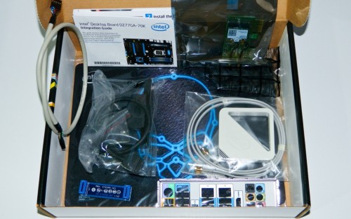 Intel’s bundle includes black Bluetooth receiver with gray USB cable, Azurewave Wi-Fi PCI (m-PCIE) module with two white antennae, four blue UV SATA cables, 3.5″ bay USB 3.0 unit, blue flexible SLI/CFX VGA bridge, users manuals and software/drivers disc. The asking price is $229.99 US with a 3 year parts and labour warranty.