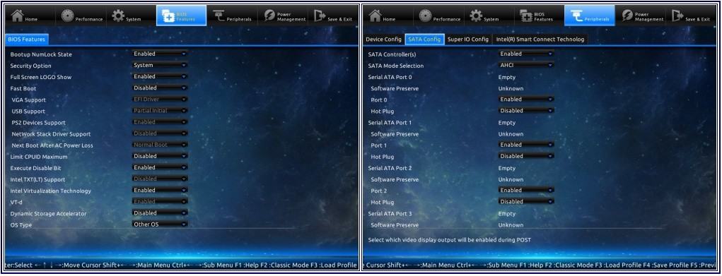The BIOS Features page contains more miscellaneous settings not commonly used. You’ll find the Peripherals page contains boot device, SATA, IO, and all the Intel built in feature settings. Despite a couple editing issues and crammed text, users will probably be able to figure things out if they’re familiar with BIOS options. I did also notice the lack of explanations and information bar when clicking on settings.