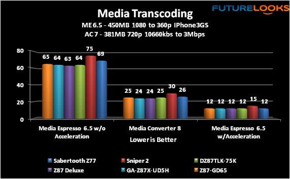 As you can see, these are very similar sized files found on small video cameras and smart phones. Even the old school Core i7-2600K isn’t far behind the three 4th Gen Z87 motherboards. If you’re a social media hound, either of these boards will more than suffice even without a video card.