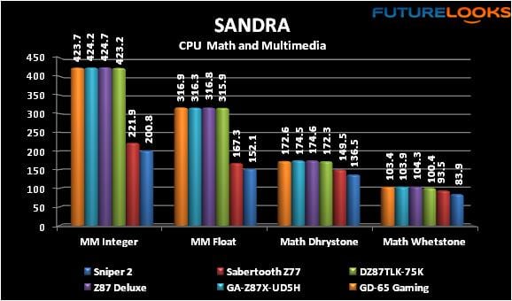 Motherboard tuning plays a significant role in overall performance. To identify which boards are wired for the best results, the platforms were tested with SANDRA Mathematical and Multi-media. I was surprised to see the three boards perform so similarly this time. Usually, there is more than just a miniscule 5% difference and there really isn’t even that. There’s just no decisive winner here.