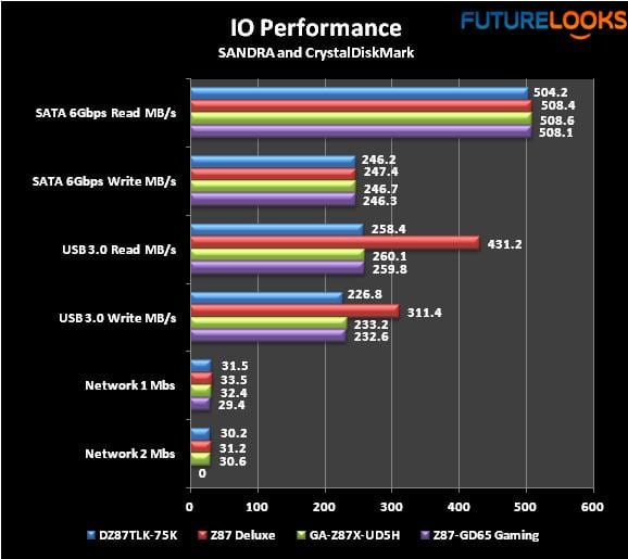 Since the Z68 days, ASUS has been implementing their own special flavor USB 3.0 Boost and UASP drivers. When either is enabled, performance is much faster than the default USB 3.0 devices. As you can see, the enabled setting leaves the rest behind considerably. When it comes to SATA 6Gbps performance, it’s more even since it’s all Z87 Express Chipset controlled. Networking tests over the internal network favors the Intel Gigabit controller whereas the Killer E2100 is just a bit slower.