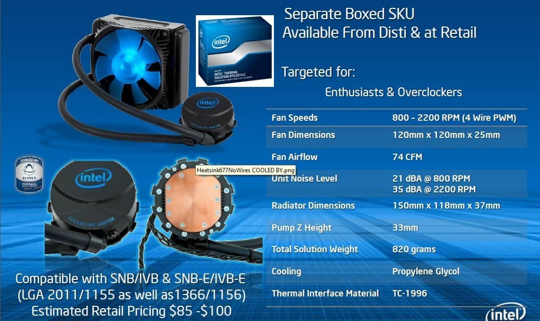 The last couple processor launches have come with some various CPU cooler alternatives. Unfortunately, those coolers just didn’t indicate that there is an extreme edition processor underneath. Asetek and Intel got together to offer an after market all in one liquid cooler (RTS2011LC) that does that and shows a little Intel love at the same time. This badged cooler can be optionally purchased between $85 and $100 US/CA from distributors and retailers.