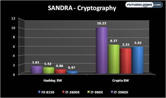 The trend basically continues here with the Core i7 just about leading with the exception of the FX-8150’s bandwidth. The point that should be made is that the Core i7-3960X blasts past previous generations. The poor Bulldozer is on the verge of looking really sad.