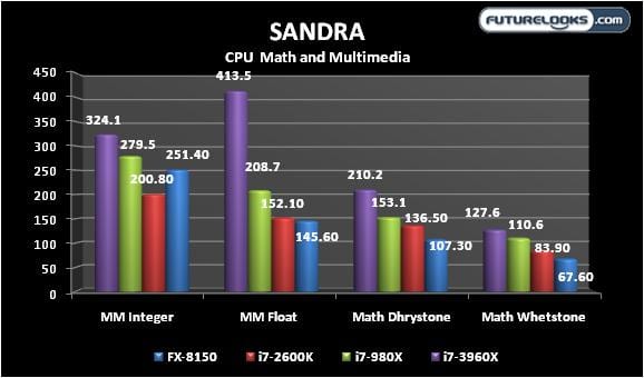 The 3960X enjoys a hefty boost in both computational and multimedia benchmarks. The FX-8150 surprised me in the Integer score which could be reproduced. The Core i7 series essentially dominate the mathematical scores.