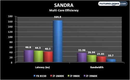 The trend basically continues here with the Core i7 just about leading with the exception of the FX-8150’s bandwidth. The point that should be made is that the Core i7-3960X blasts past previous generations. The poor Bulldozer is on the verge of looking really sad.