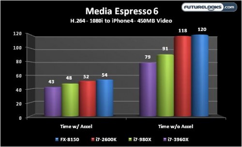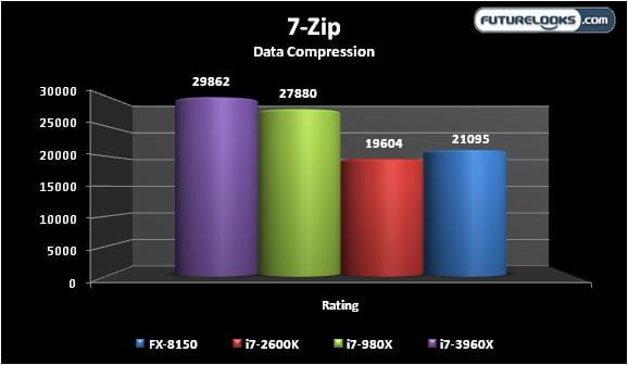 Naturally, the FX-8150 keeps within range of the 2600K. There’s a slight performance gain in that the 3960X shaves off a few seconds compared to the 980X. The revised silicone in the new hex-core seem to be handling the task a bit more efficiently.
