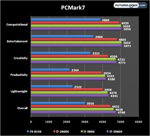 The 3960X enjoys a hefty boost in both computational and multimedia benchmarks. The FX-8150 surprised me in the Integer score which could be reproduced. The Core i7 series essentially dominate the mathematical scores.