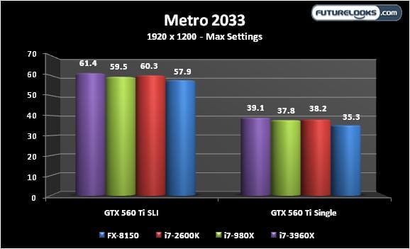 This is a familiar trend. This game slaps every video card on the planet silly even when using more than one. Frame rates are relatively close with only slight gains in favor of the new 3960X but not enough to warrant standing on the soap box. As I mentioned before, the 2600K continues to be a formidable gaming platform.