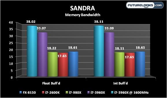 The 2600K continues to show off its great integrated memory controller getting close to the matching the 980X at stock settings. The FX-8150 does quite well here but what good is all that bandwidth if it can’t efficiently use it as we saw above. The 3960X cranks out some serious bandwidth at 1333MHz and even more at the CPU’s supported 1600MHz.