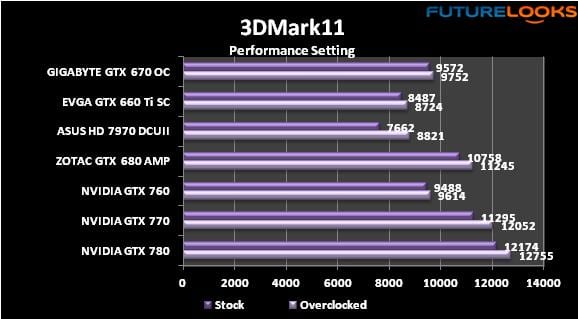 The GTX 760 may seem like it’s not doing well but 3DMark11 puts more of the video cards’ resources to work. Naturally, the cards with the higher memory, higher memory bit rate, more shader processors, and matching frequencies outpace the GTX 760. This is still a respectable score against so many factory overclocked cards.