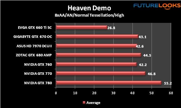 With the higher detailed settings, Heaven beats just about any GPU down pretty hard. But even here, the GTX 760 keeps up with the GTX 670 OC which has better resources on tap, but a much higher price tag as well. It all seems to come down to frequency and bandwidth which is right up there on the GTX 760.