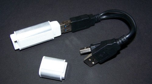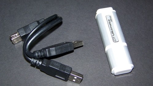 The DTU 3.0 features an attractive “storm trooper” white plastic housing that’s a little larger than some USB flash drives. It also utilizes a dual USB adapter cord for connecting to USB 2.0 ports only. Otherwise, only one end needs to be connected for this USB 3.0 device to function. We’ll talk about that more in a sec.