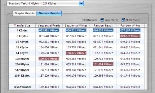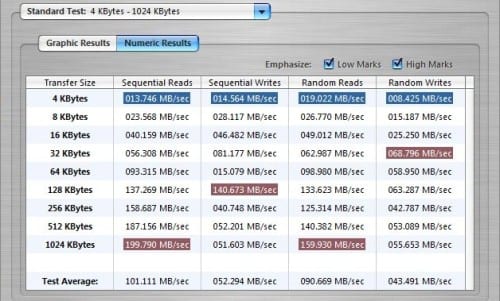 Repeating the same process, CDB’s 100MB test was performed allowing 5 passes for an average while blending the major block size results including Sequential tests.