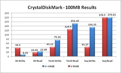 The results here a interesting. You can see that the Sequential Read matches the V+ Series 64GB. But, it’s in fact slower on the the Seq Write performance. That may seem like a kick in the pants, but this benchmark indicates that the 40GB is operating just above spec and it gets better.