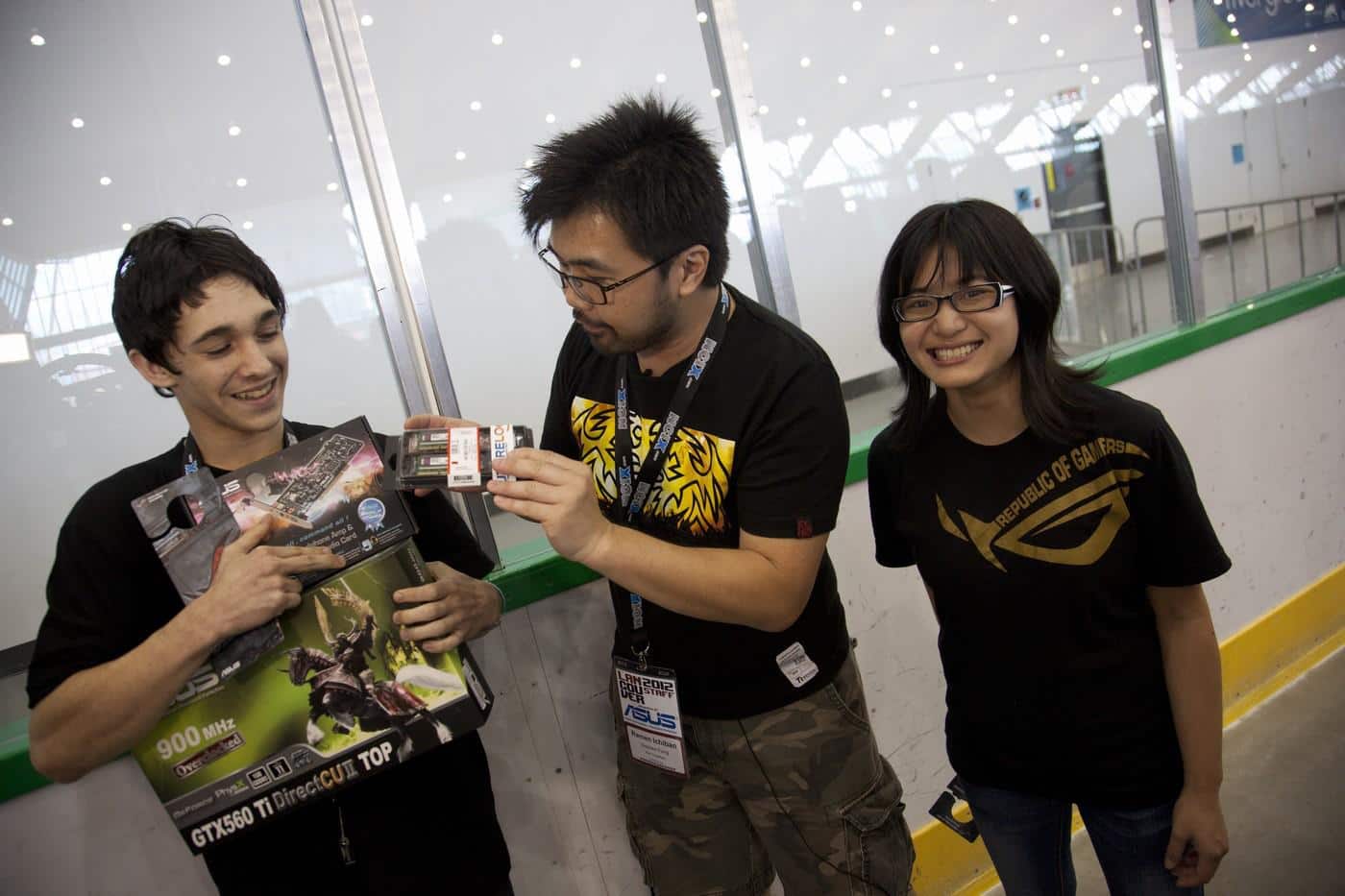 At the end of the competition, one wall sitter reigned supreme and walked away with an ASUS Xonar Audio Card, an ASUS GTX 560 Ti Direct CUII TOP graphics card, and a Kingston HyperX PnP DDR3 notebook memory kit. That made Patti from ASUS very happy as we can see in the photo above.