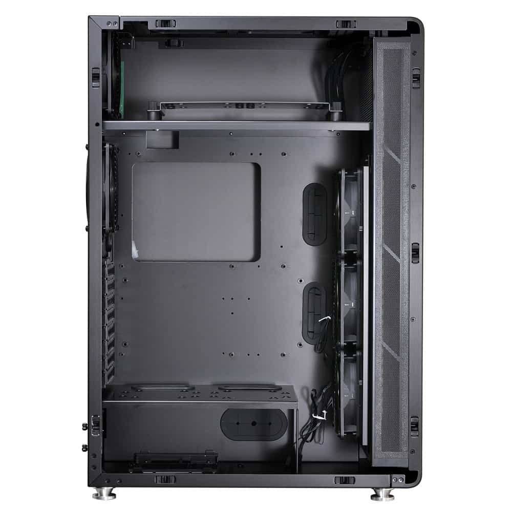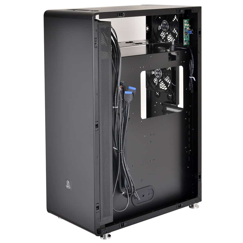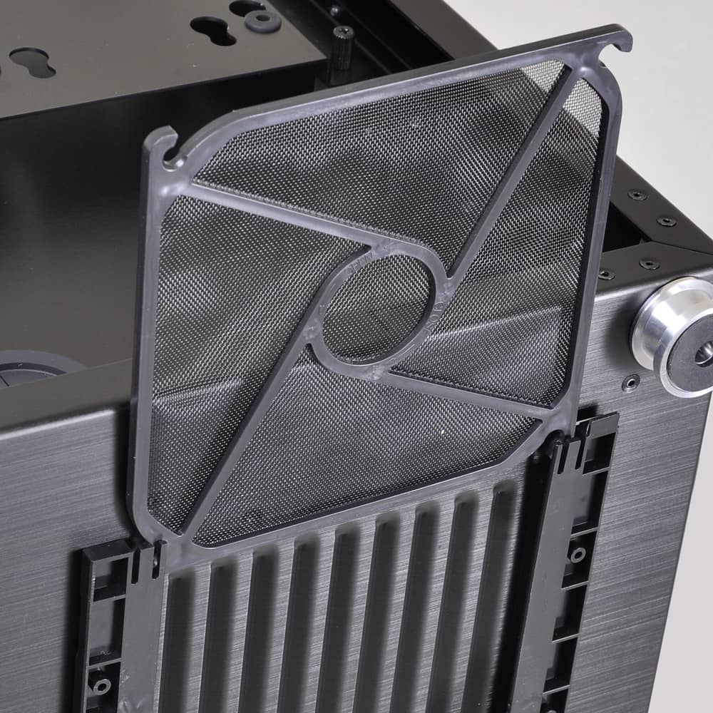 The Case is trisected into three airflow chambers. Three 120mm fans pull air through two long intakes along the front of the side panels. Each is covered by a washable magnetic mesh air filter strip. An additional two 120mm fans vent the top and central compartments, while the PSU exhausts the bottom compartment itself. This divides the airflow between the PSU, motherboard, and drive bay area so they don’t influence each other. The included fan controller helps get the cooling just right.