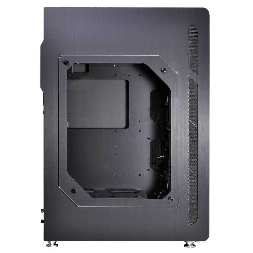 The front exterior of this case looks to be rather imposing. Think monolith from 2001: A Space Odyssey imposing. This is due to the complete lack of external drive bays. There are no slots for an optical drive, or a card reader. Just black, with some badging and a couple LEDs on the front. This isn’t really a downside though, as optical drives are becoming less and less necessary and useful in a PC build.