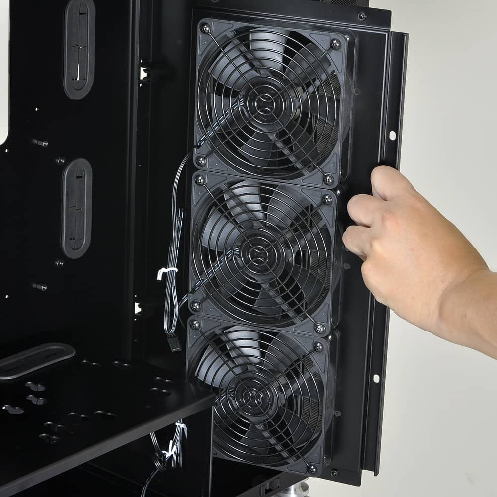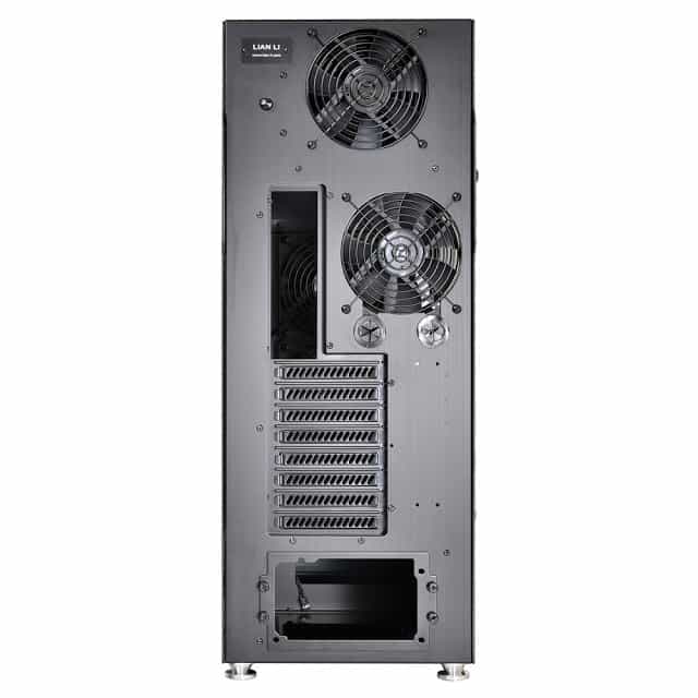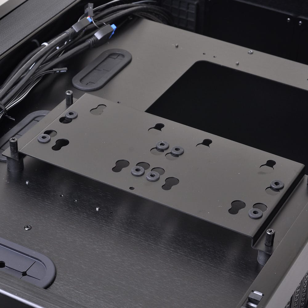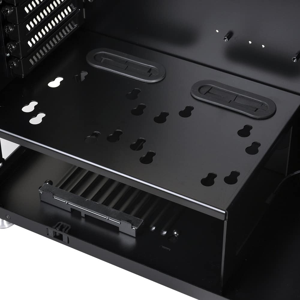 In the main compartment, two additional drives can be mounted on top of the PSU enclosure, bringing the grand total to eight! The three 120mm intake fans are mounted on a tool free holder; it can be taken out with just two thumb screws and replaced with a full-sized 360mm water cooling radiator. Pre-punched holes are located near the eight expansion slots to mount the optional tool free PCI retention system: http://www.lian-li.com/en/dt_portfolio/pci-01/