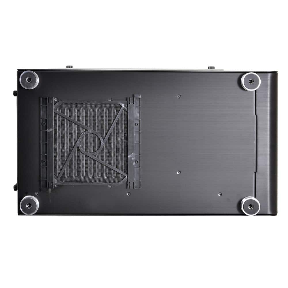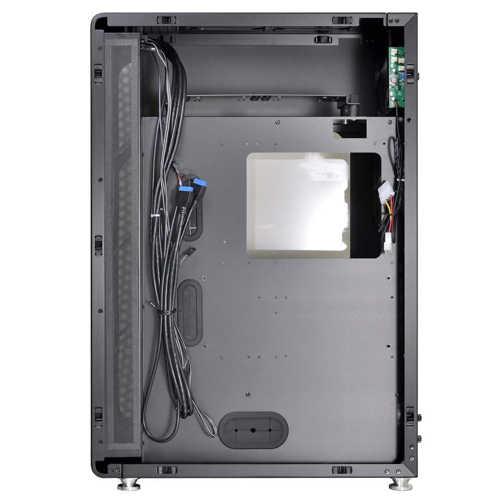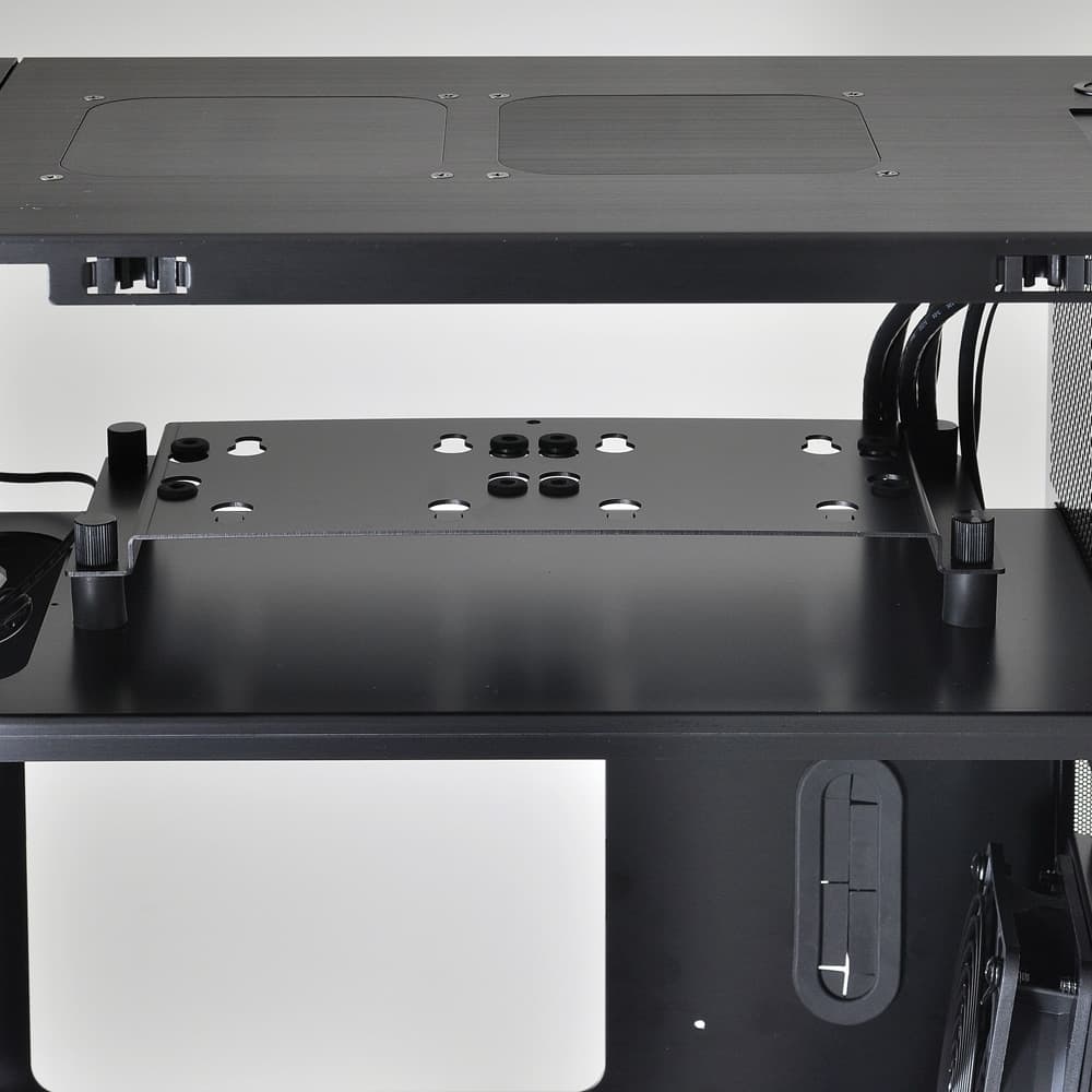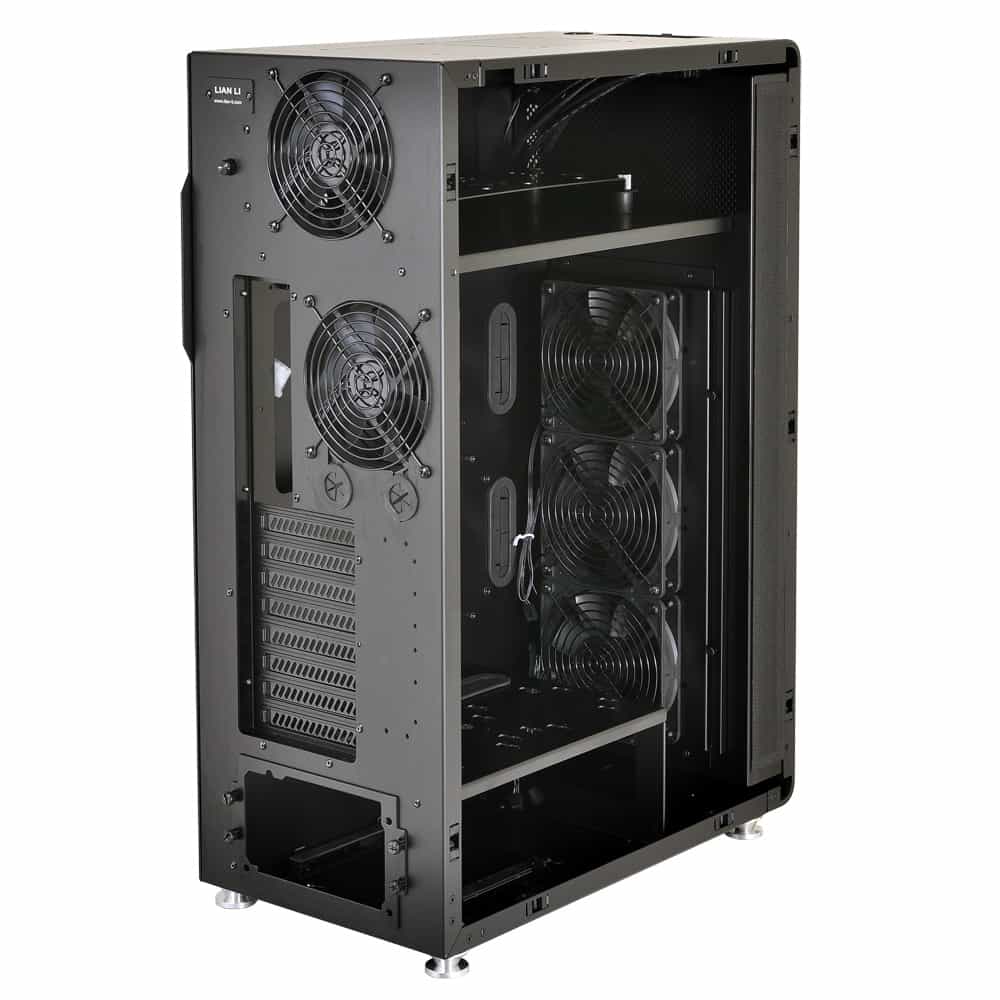 In the main compartment, two additional drives can be mounted on top of the PSU enclosure, bringing the grand total to eight! The three 120mm intake fans are mounted on a tool free holder; it can be taken out with just two thumb screws and replaced with a full-sized 360mm water cooling radiator. Pre-punched holes are located near the eight expansion slots to mount the optional tool free PCI retention system: http://www.lian-li.com/en/dt_portfolio/pci-01/