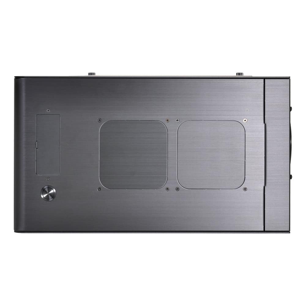 The top compartment of the PC-X510 features two removable drive trays mounted on shock-absorbing rubber grommets. Each tray holds two drives for a total of four 2.5” or 3.5” drives. One or both of the trays can be removed to accommodate ambitious cooling setups – up to two more additional 120mm fans or a 240mm water cooling radiator. An additional mount is located behind the motherboard allowing one tray to be hidden in the rear. It can be relocated from the top, or purchased separately to complement the two included, making a total of up to six vibration-dampened drives.