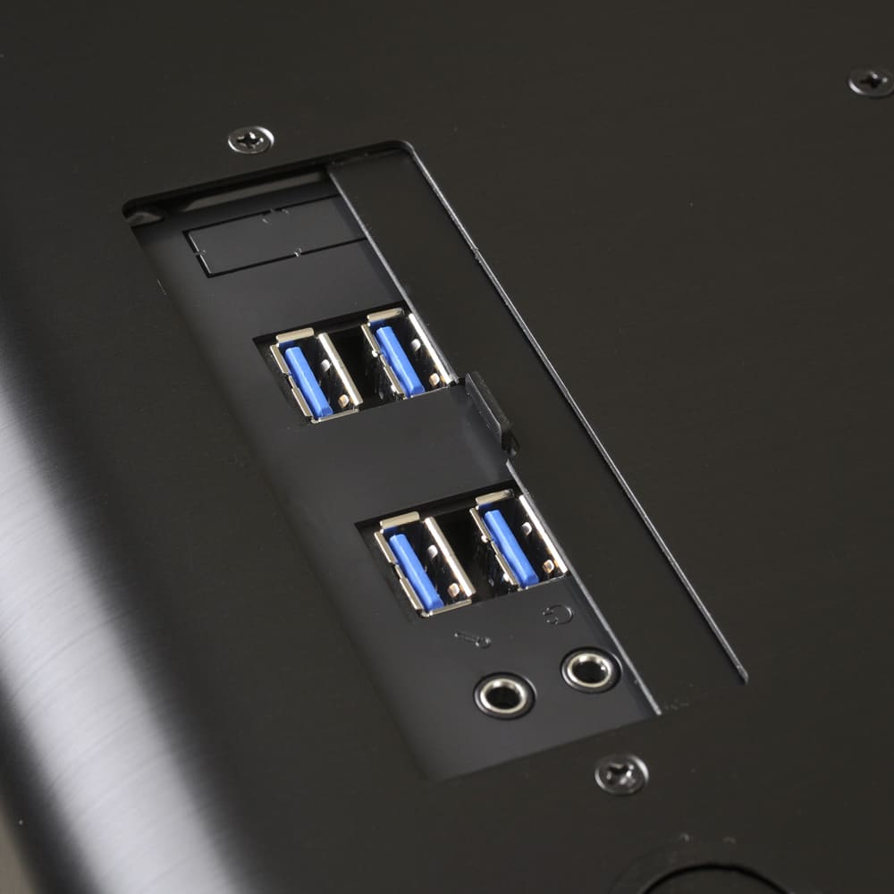 The PC-X510 offers HD audio in/out and four USB 3.0 ports on its top panel with a sliding cover. All air filters are removable, washable, and replaceable. The case stands on aluminum stands with rubber feet to prevent slippage. The back panel features liquid cooling grommets with mouse ears to allow external all-in-one water cooling kits to pass inside the case. The PC-X510 also includes a fan controller to adjust fan speed between 60% and 100%.