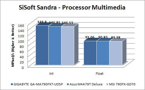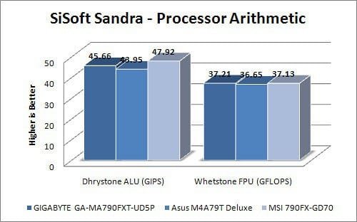 Our round of benchmarking started with SiSoftware Sandra. This program features a series of stress tests and benchmarks that can be used to determine if a component is functional and how well it performs. We started with some CPU tests, to see how each motherboard performs with the same hardware. For the Processor Arithmetic test the result is determined by measuring the time it takes to perform some sequences of instructions. In this test the MSI board performed is a fashion very similar with the ASUS and GIGABYTE boards. There was a minor performance burst in Dhryston testing, but nothing statistically relevant.
