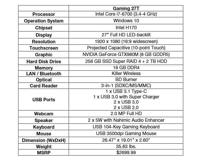 MSI says that even the most hardcore gamer will be impressed with the Gaming 27T. You get 6th-gen Core i7 processors, GTX 980M graphics, a 27-inch full LED touchscreen display, two HDMI-out ports for external monitors, Killer Wireless, Killer DoubleShot Pro, a 256GB SSD Super RAID 4 with a 2TB HDD, and 16GB of DDR4 memory. They’re even tossing in a gaming keyboard and mouse for good measure.