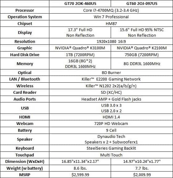 The basic design for the new MSI GT60 20K and GT70 20J are the same as the MSI GT Series gaming laptops shown off at COMPUTEX 2013 along with the same base name. The difference between the two versions comes from the use of Nvidia Quadro K2100M and K3100M for graphics muscle. The MSI GT60 20K and GT70 20J are certified by Adobe, Autodesk, and SolidWorks. All of which give their seal of approval to allow the MSI GT series to run these most commonly used professional applications.