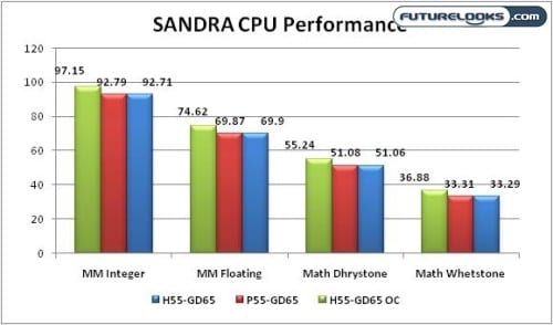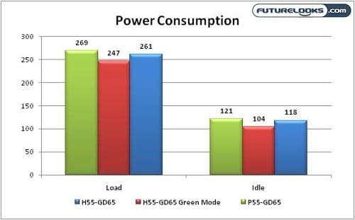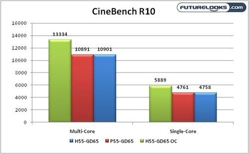 Here, you can see just how well the H55-GD65 does with some aggressive CPU overclocking. The motherboard easily unleashes the beast from within a rather docile Core i5 661 Clarkdale processor.