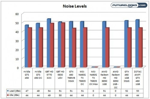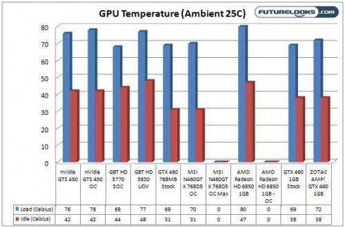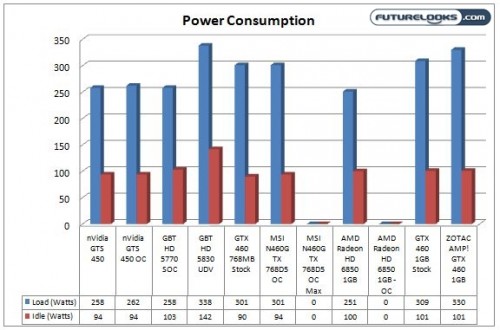 For the reasons we mentioned earlier in the review in the test notes, the consumption numbers for the overclocked to the limit MSI GTX N460GTX and the HD 6850 cards were omitted. Looking at the consumption numbers for the ZOTAC AMP! Edition GTX 460, the factory overclocked card does consume a good amount more energy than a stock card. I’m actually surprised that ZOTAC doesn’t recommend more than a 450W PSU in their system requirements. Even the MSI N460GTX lists a minimum of 550Watts. Of course, with an overlock of 895MHz on the MSI vs the 810MHz of the ZOTAC, plus the MSI is running more voltage, I’d estimate just under 400 watts consumption already.