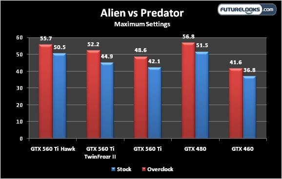 This game is such a resource hog at higher resolutions, it’s not even worth tweaking to reach playable frame rates. Still, the raw GPU power of the Hawk shows the colors of its feathers. If you happen to overclock your CPU a bit, you’ll see frame rates that top the GTX 480 easily.